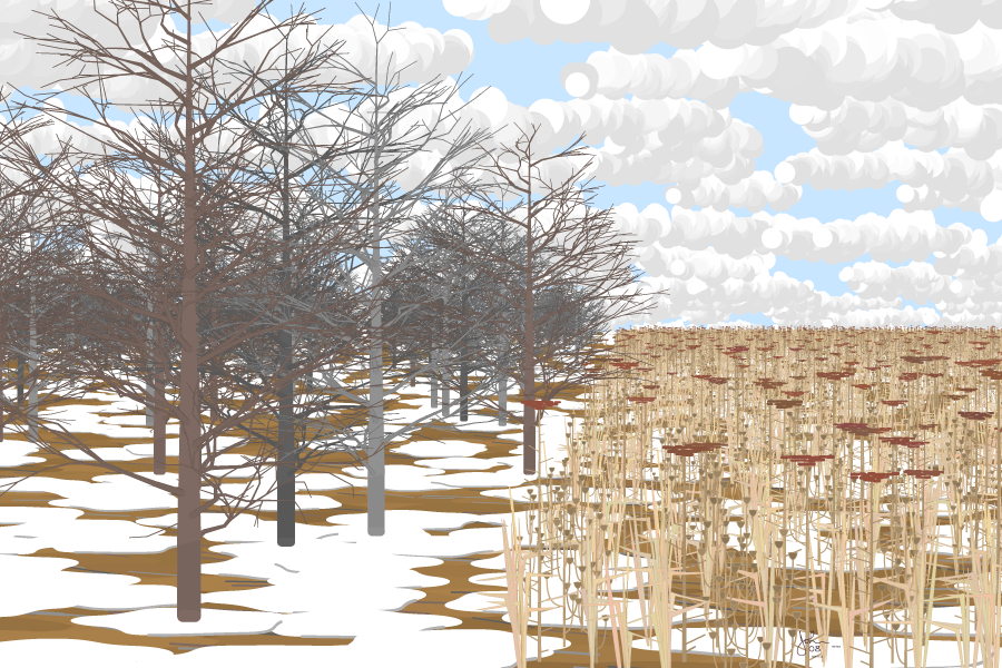 Imagine a cool raw cloudy late-winter day. On the left a barren woodland and on the right a weedy field in tawny-beige colors. There is patchy snow on the ground with its implied promise that winter is retreating.