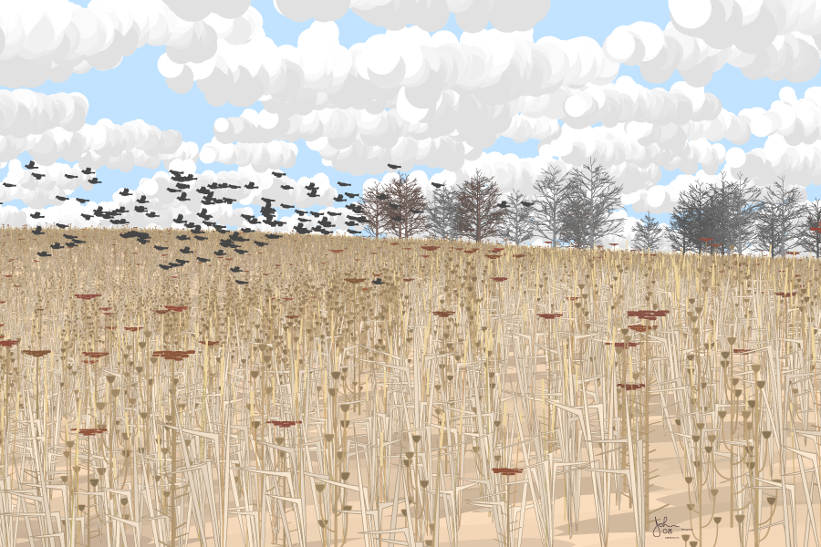It is autumn and the greenery and flowers of summer have been replaced by brown and tan. In the foreground is a patchy, weedy gently sloping untended field, with a straggly line of barren trees at its farther edge. A migrating flock of blackbirds heads south.