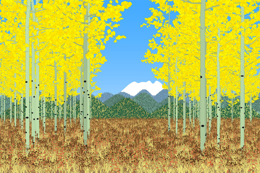 The autumn image shows a favorite scene of many -- golden aspens at their most colorful. Through the magic of art each leaf is at full color and none have dropped off yet. We have had the luck to take our hike on a clear, crisp sundrenched day.