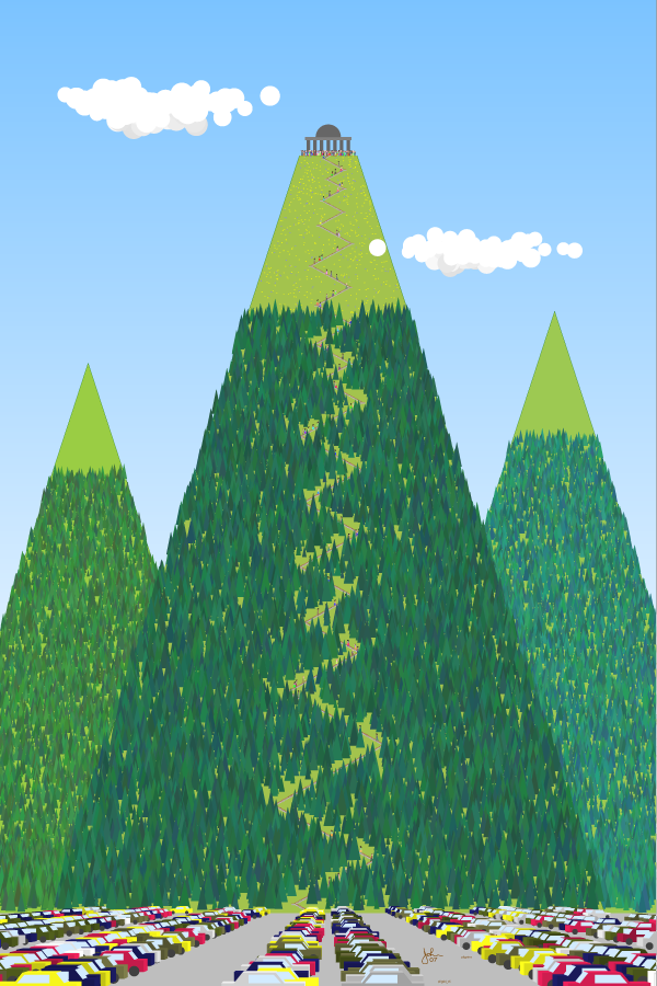 The antlike people seem lost in the vastness of the mountains. The mountain is so high that as they near the summit they are above the clouds.
