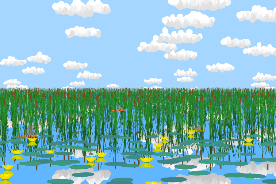 A calm, summery day in a marsh with fluffy fair-weather clouds in the sky. Water lilies are in bloom and colorful dragonflies hover about. You are paddling along in the shallows in your canoe and this is what you see. The sky, the reeds, and the water lilies, are all perfectly reflected in the still water.