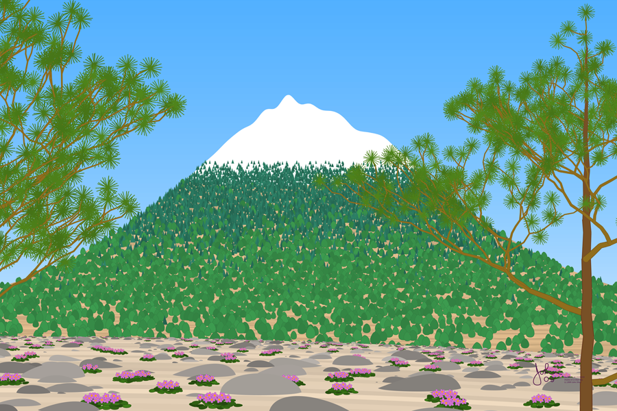 Mountains appeal to people. Climbing a mountain is a boasting opportunity and can be spiritually fulfilling. Mount Shasta is a nice example -- it stands in lofty splendor at some distance from other peaks, with the conical shape which tells you it is a volcano. The view here is that of someone standing on a neighboring high peak, with a foreground of alpine flowers and rocks framed by two gnarly pines. Shasta is popular for climbing among energetic people in their twenties and thirties (and some older).