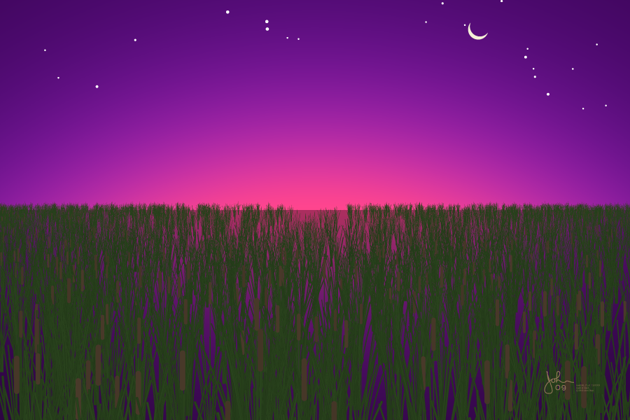 I think of this as sunrise, although it could as well be dusk. A clear, cloudless day in summer. The last stars are just "winking out" and a pale slivery moon is visible. In reality, you will not see any stars when the dawn light gets this bright. But this is art, not photography; an effort to capture the "impression" of sunrise.