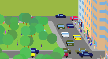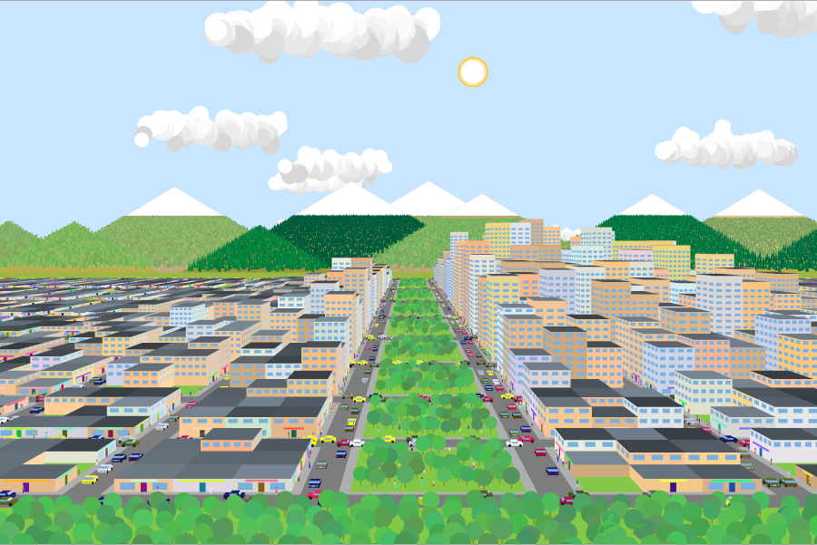 If you compare the size, position, color, etc. of the mountains from one Beigeburg image to another you see the effect of random numbers in action. Each image has a different set of mountains. Close study shows that the same conclusion holds for the buildings, cars, pedestrians. About the only thing that remains constant from one image to another is the streets.