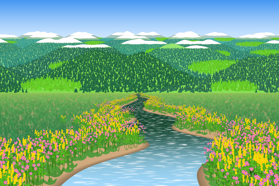 It is a clear day in spring or early summer. We stand upon the flat plains gazing up to the snow-capped peaks in the background. A clear stream flows out across the plains from the mountains, with riparian flowers blooming on both sides. It is before "settlement", and even before the appearance of humans (thought to be about 20,000 years ago). The mountains are covered with dark conifers and pale aspens. Serene, quiet.