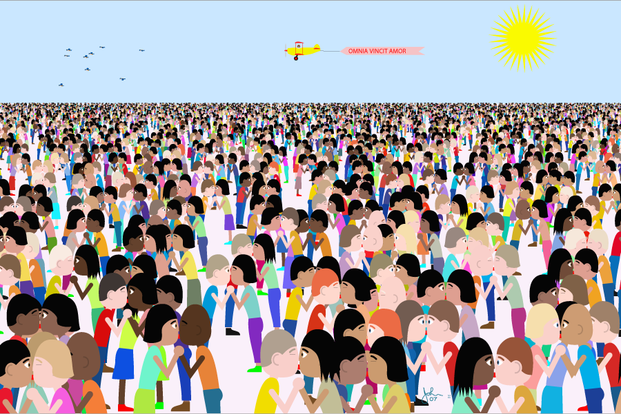 We see many pairs of lovers under a summery, sunny sky. By themselves they are unremarkable. They are dressed like typical high school or college students of the present day. What is different about them is that each has unique skin, hair, and eye colors. These colors are chosen at random in such a way that their distribution resembles the skin-hair-eye color distribution of the world population of homo sapiens. This image of "equal opportunity kissing" will not be popular with social conservatives.