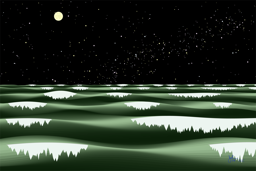 Waves have long fascinated artists. "Seascapes" are a recognized genre of art. This image and its companions are a new departure in John Art. The ocean surface is generated by a series of sinusoids with random amplitudes which is a technique I have not used before. In other words they are examples of "noise" -- a phenomenon much seen in the real world. There are two sets of sinusoids -- one which represents the noisy and chaotic ocean surface, and another that runs only in the near-far direction and represents coherent "cuspy" waves in an orderly sequence. Either without the other would give a dull and uninteresting picture.