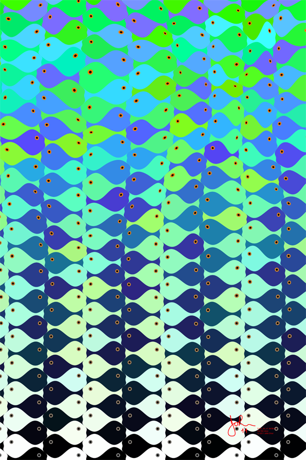 Tessellation. Much like some of the previous fish images, but with a gradation. At the bottom the fish are perfectly ordered without distortion, and are black and white. Both the color and the distortion progressively increase as you go up, so that the fish at the top have "come alive" and appear to swim.
