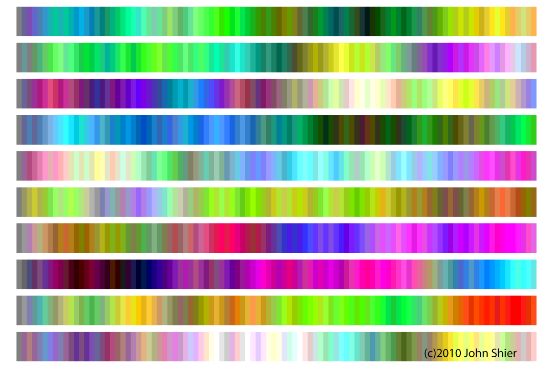 This is what you get when each of the 3 colors (RGB) is subject to random walk. At each step from left to right the color either increases by an amount +s or decreases by an amount -s -- at random. It is seen that in almost all cases two adjacent stripes are visually distinguishable in color. The starting color is at the left -- a "50% gray". One sees that depending on random chance one gets a great variety of color sequences.