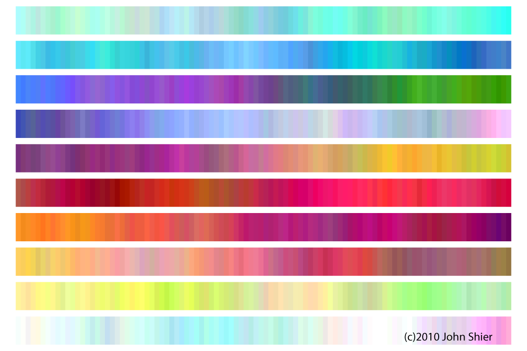Here at each step from left to right the color either increases by an amount randomly positioned between +s and -s -- i.e., one gets steps of many sizes. The value of s is much smaller here than in image 18, so that the color change is much slower and the step-to-step color change is often hard to see.