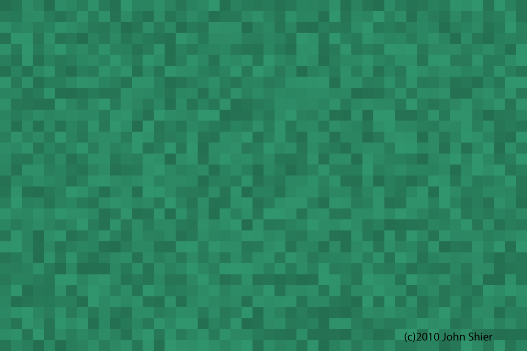 This is pure randomness or "color noise", just like picture 1 except that it only varies the color along a line in the "green" part of color space. It looks like the same color with varying "light-dark" or "luminance". Such an effect can be useful in distinguishing different objects of the same kind in a natural scene -- for instance green trees or foliage. I often use this type of randomness in landscape images.