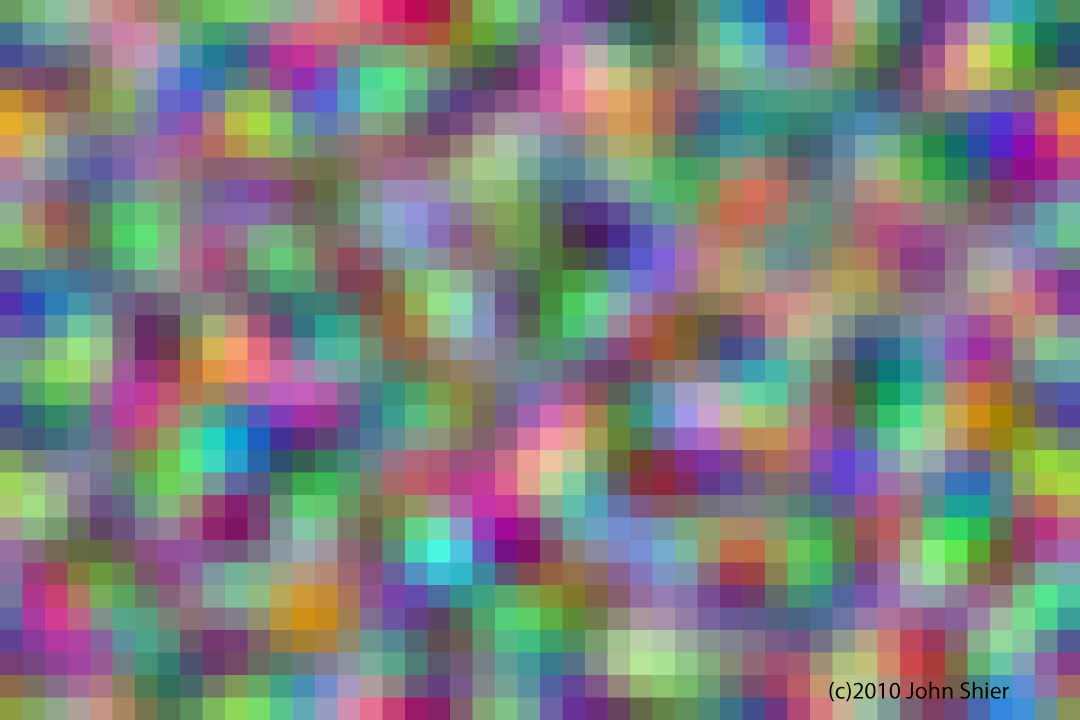 Here randomness has been expressed as the sum of a series of products of cosine terms in x and y. The coefficients in front of these cosine terms are random numbers -- the usual way of representing "noise". There are up to 9 wavelengths from left to right and up to 6 wavelengths from top to bottom. This is quite unlike pure random noise in that the color glides smoothly from one part of color space to another as one moves across the image, i.e., the colors in adjacent squares are mutually correlated.