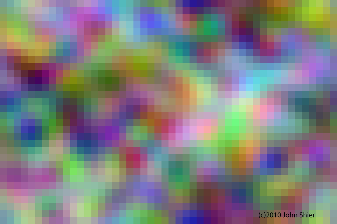 This image differs from the last one (5) in that the amplitudes of the waves are now dependent on the wavelength. The short-wavelength waves have lower amplitude, so that one sees more of the long wavelenths. The average values of the coefficients fall off as the inverse square root of the wavelength.