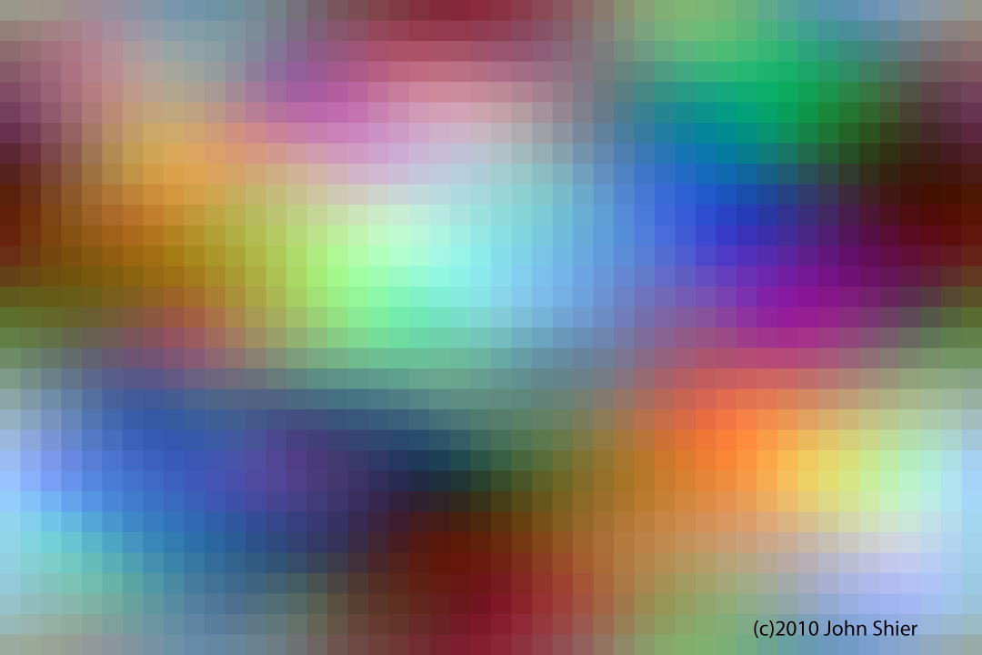 This image differs from image 5 in that the amplitudes of the waves are now dependent on the wavelength. The short-wavelength waves have lower amplitude, so that one sees more of the long wavelenths. The average values of the coefficients fall off as the inverse 1.5 power of the wavelength. It can be seen that the feature sizes are somewhat bigger, and the changes smoother than in image 7.