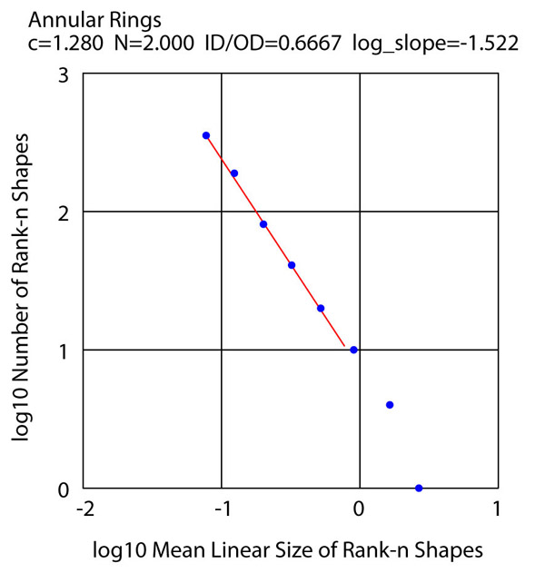 The chart gives a log-log plot of the population of each rank versus the mean ring linear dimension for the given rank. The data is close to a straight line, indicating that the ring rank populations obey a negative-exponent power law with negative exponent value approximately 1.52. The rank populations thus have a statistical distribution which many would call "fractal".