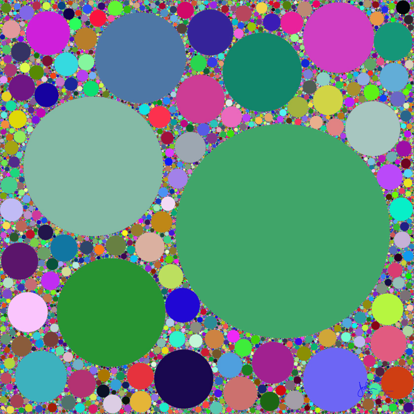 Here we see a pattern of fractal circles. The original high-resolution file contained 250000 of them but the smallest ones are not resolved here.