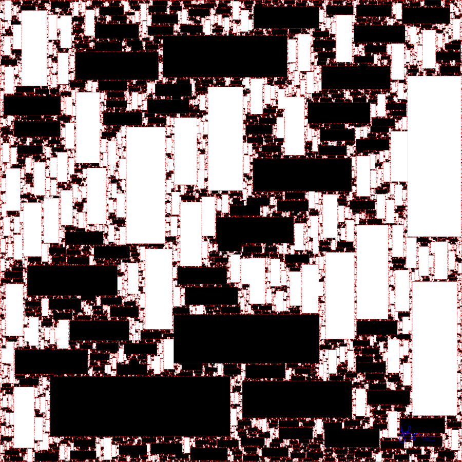 The "X" rectangles are black while the "Y" ones are white. The vacant "gasket" area is red. Study of the image shows that there are "ordered" regions of mostly-white and mostly-black. But even in a mostly-white area there are clusters of black and vice versa. This ordering is produced by the random choice of the algorithm -- constrained by the shape and position of previous shapes.