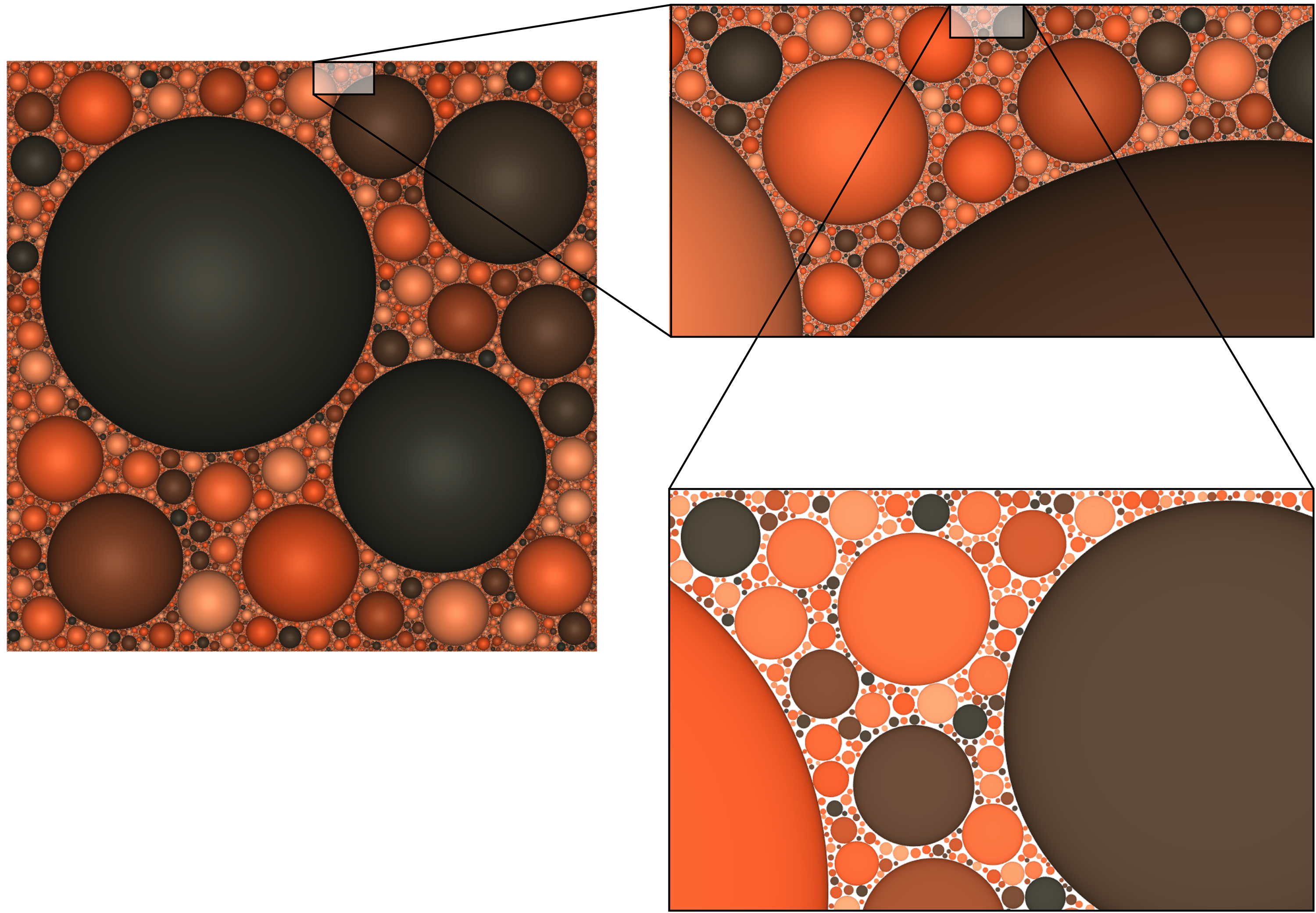 In the image below, the upper left part shows a complete view of all the data, with the circles shaded like hemispheres for easier grasp. In this image the smallest features are far too tiny to be seen. To the right is an approximate 10x expansion of the indicated region, and below this is another approximate 10x expansion of the expanded region. In this last view you can see the individual very small last-placed circles. It can be seen that even after a million circles have been placed (at almost 98% fill), there is still plenty of room for more circles of the size called for by the rules.