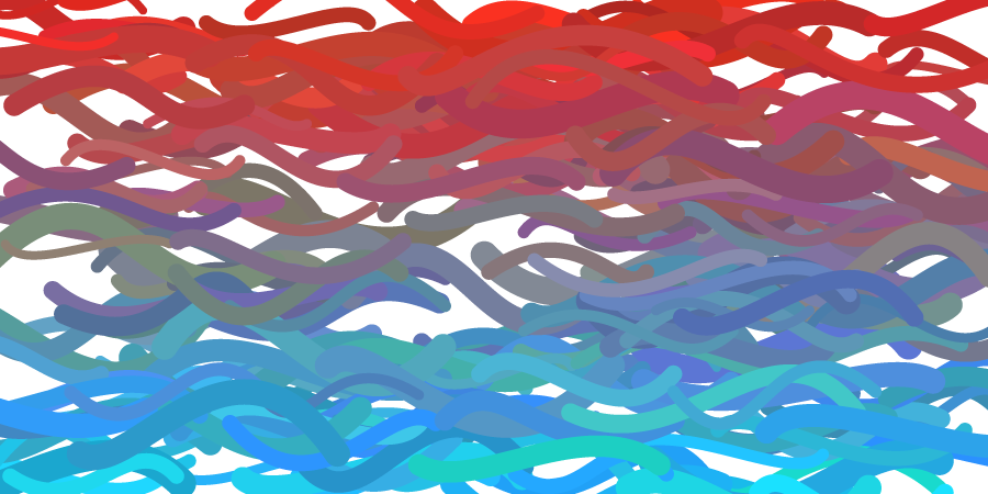 The worm color has both systematic and random variation across the image. It goes from reddish at the top to blue-cyan hues at the bottom. The program calculates a particular color for any worm which only depends on the vertical position. It then adds or subtracts a random amount (different for each worm) for each RGB value and assigns the result as the color. Thus no two worms are exactly the same color (except by unlikely coincidence). Some adjacent colors (by coincidence) are so close that it becomes hard to distinguish one worm from another.